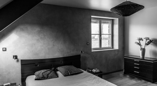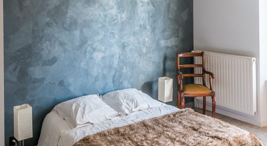 La chambre est peinte d’un ton clair et neutre. Un enduit avec une finition métallisée a été appliqué sur la tête de lit.