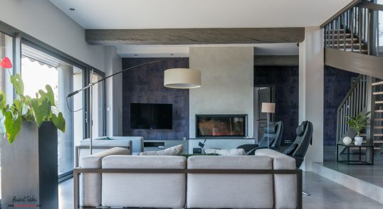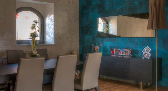 Voir plusUne touche de bleu met en valeur la pièce et l’enduit lisse nacré d’un ton neutre.